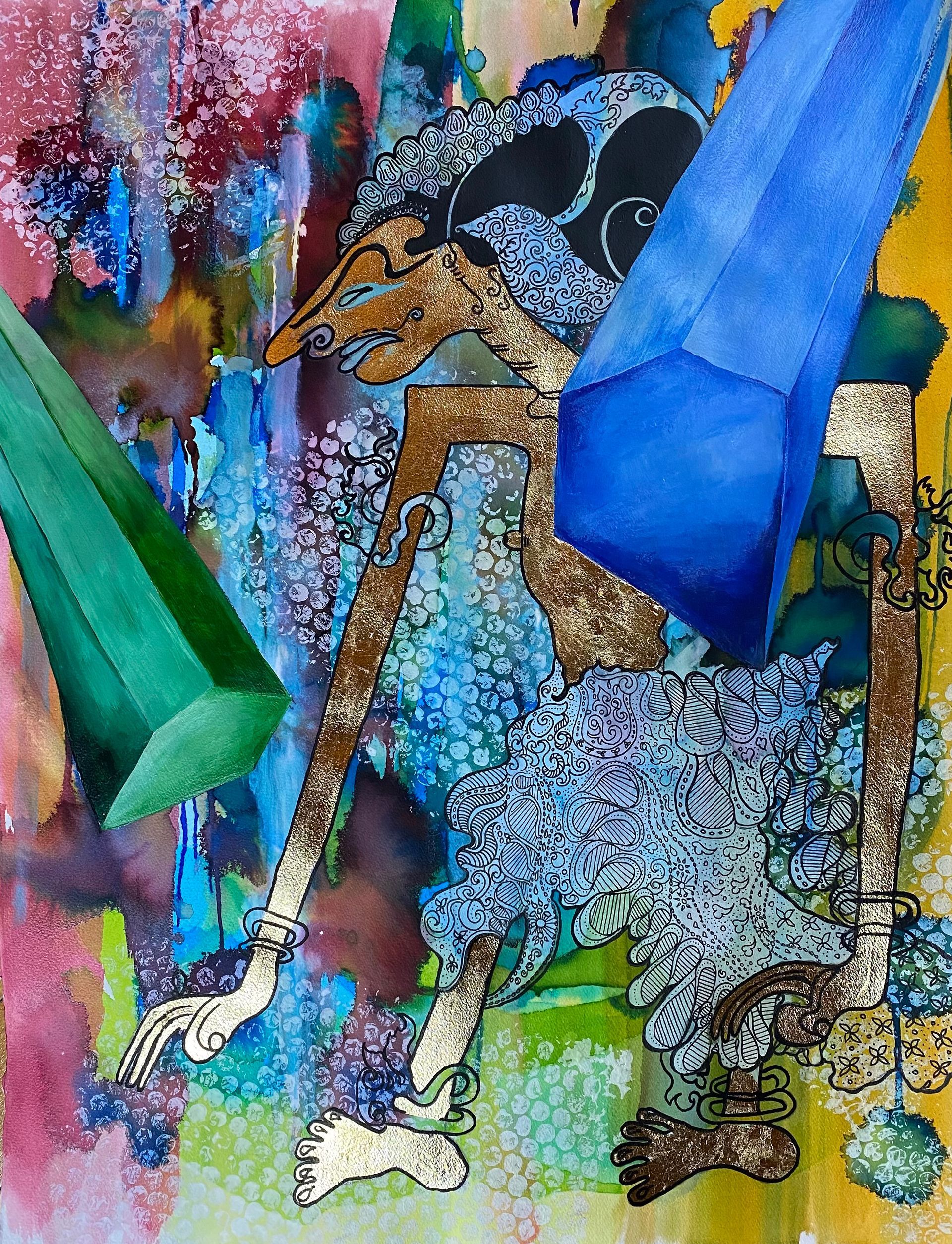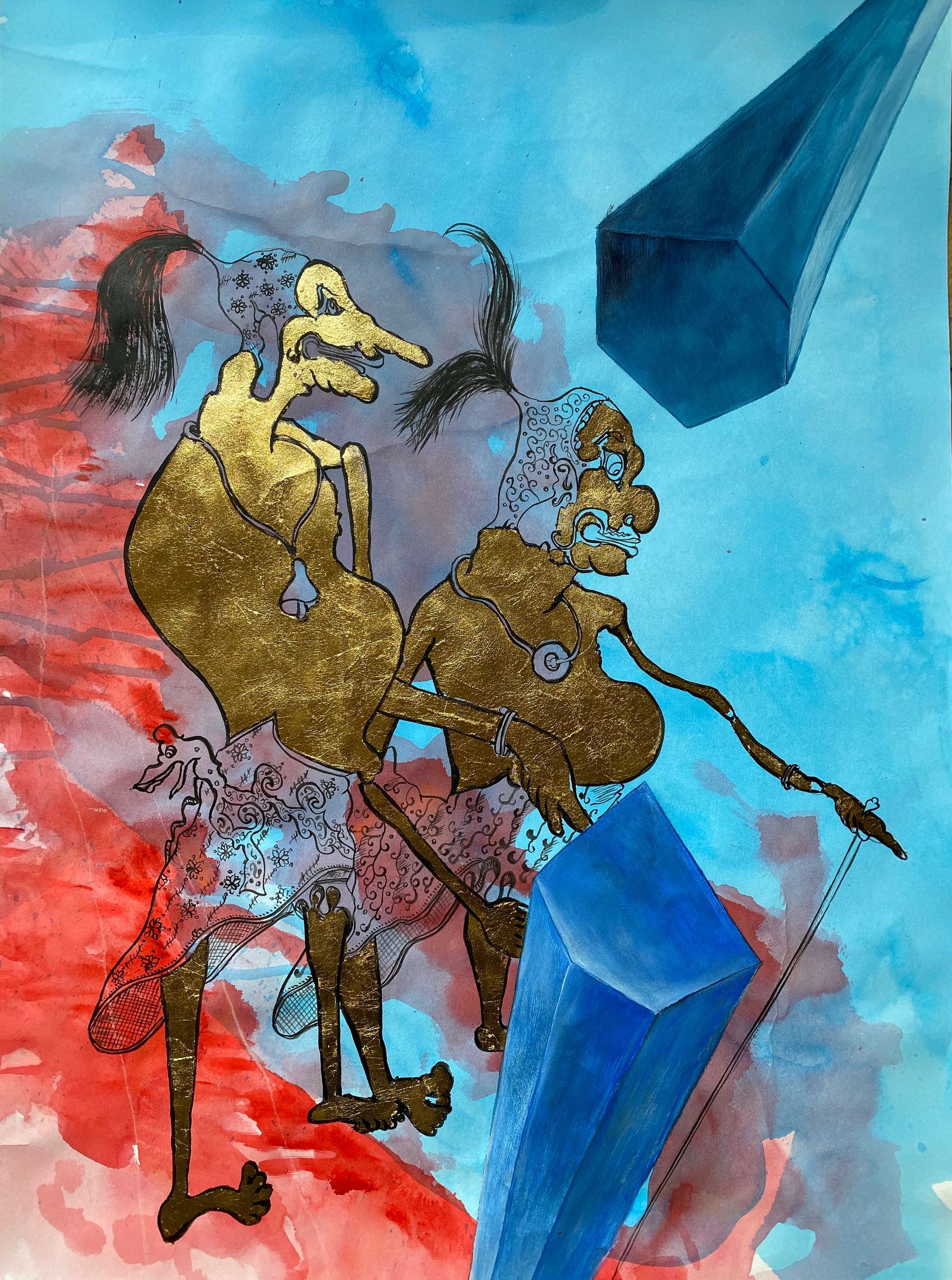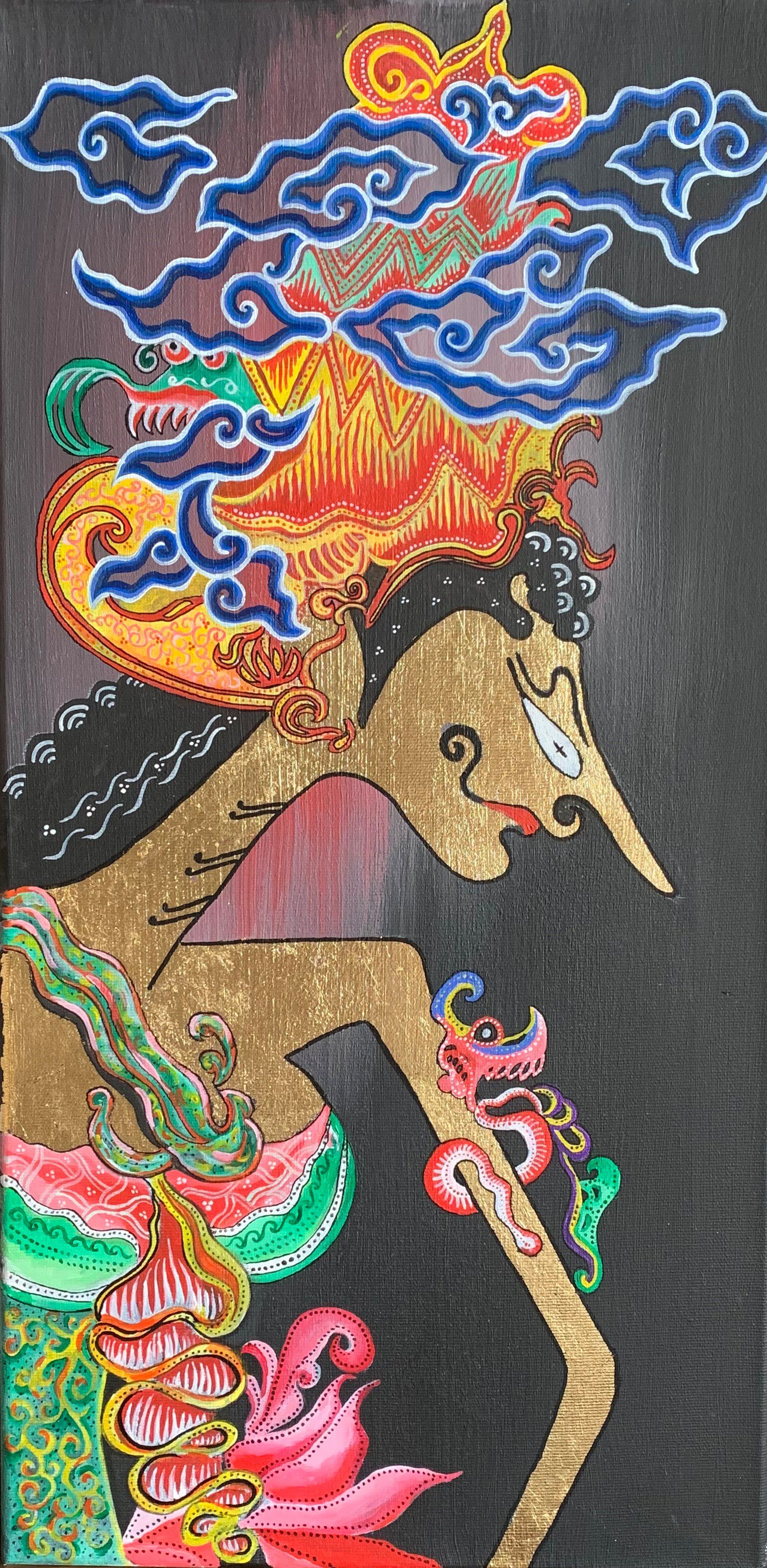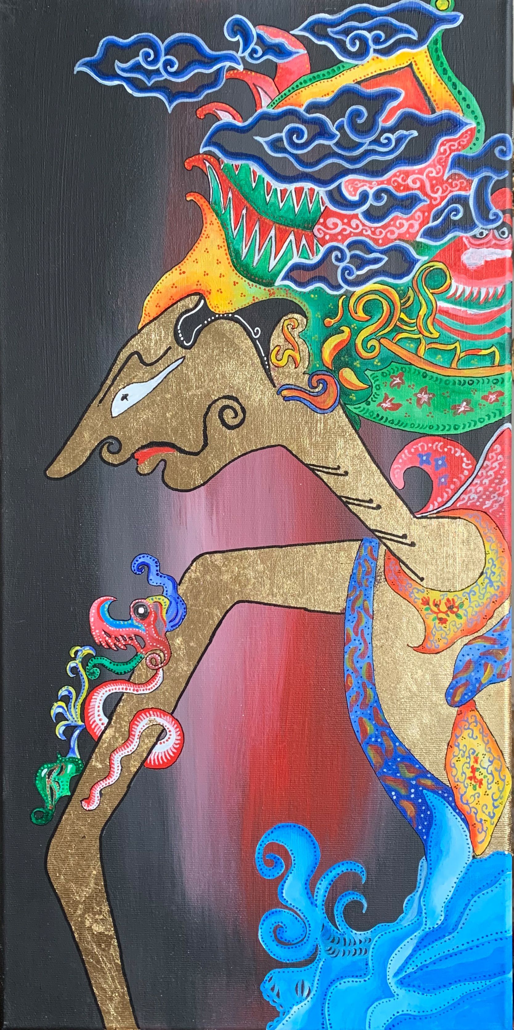 Punakawan vs Dalang SOLD Acryl and gold leaf on canvas 2022 120 x 80 cm