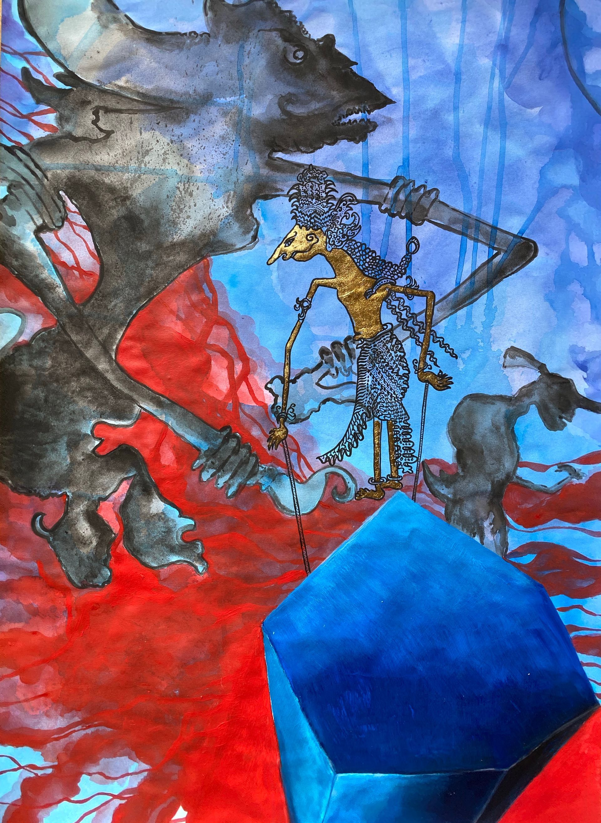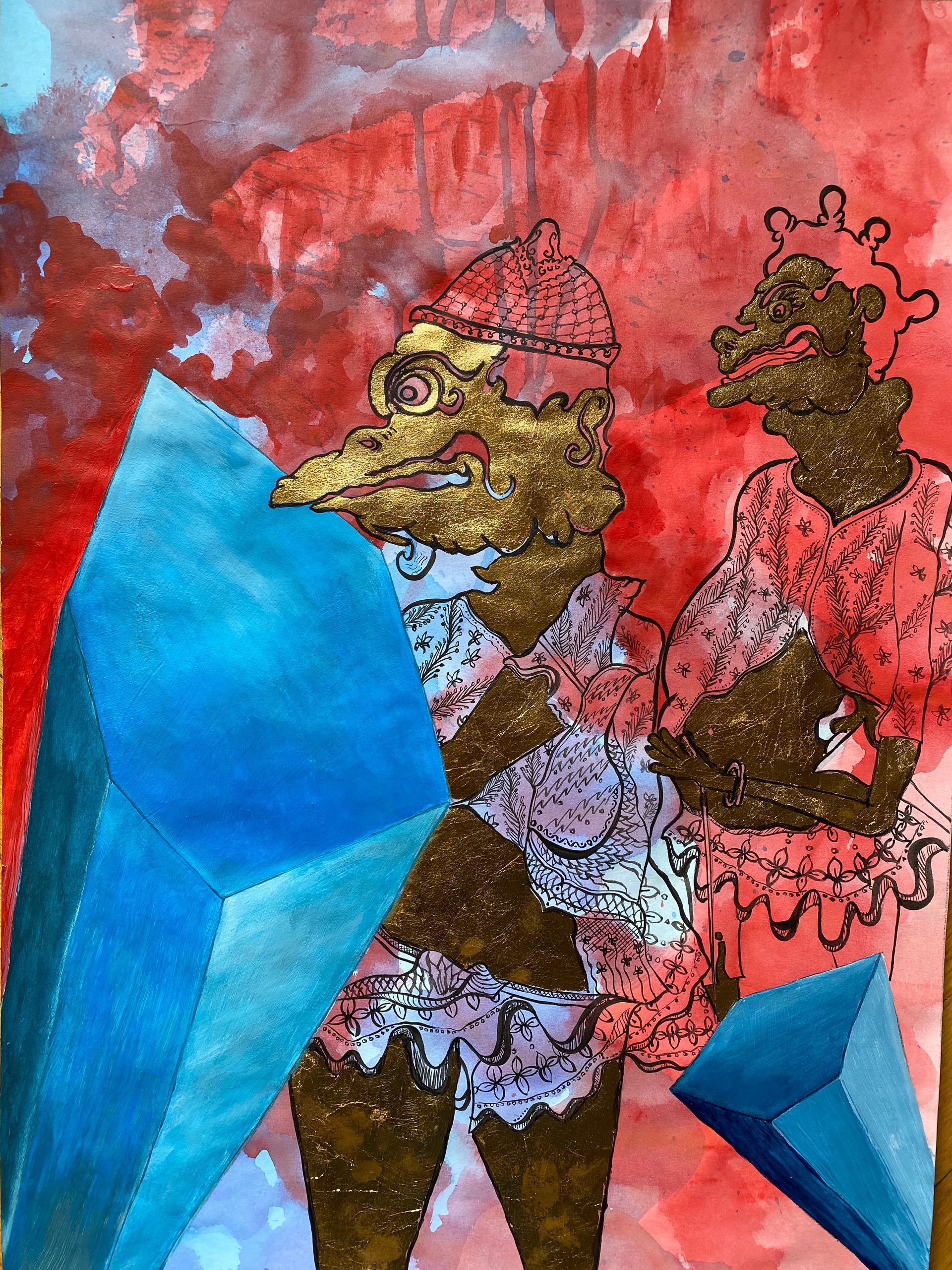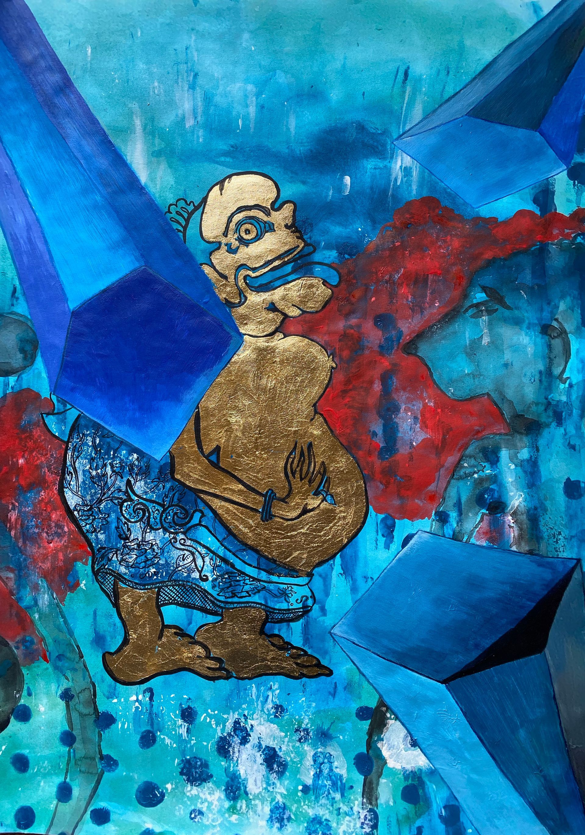Punakawan vs Dalang SOLD Acryl and gold leaf on canvas 2022 120 x 80 cm