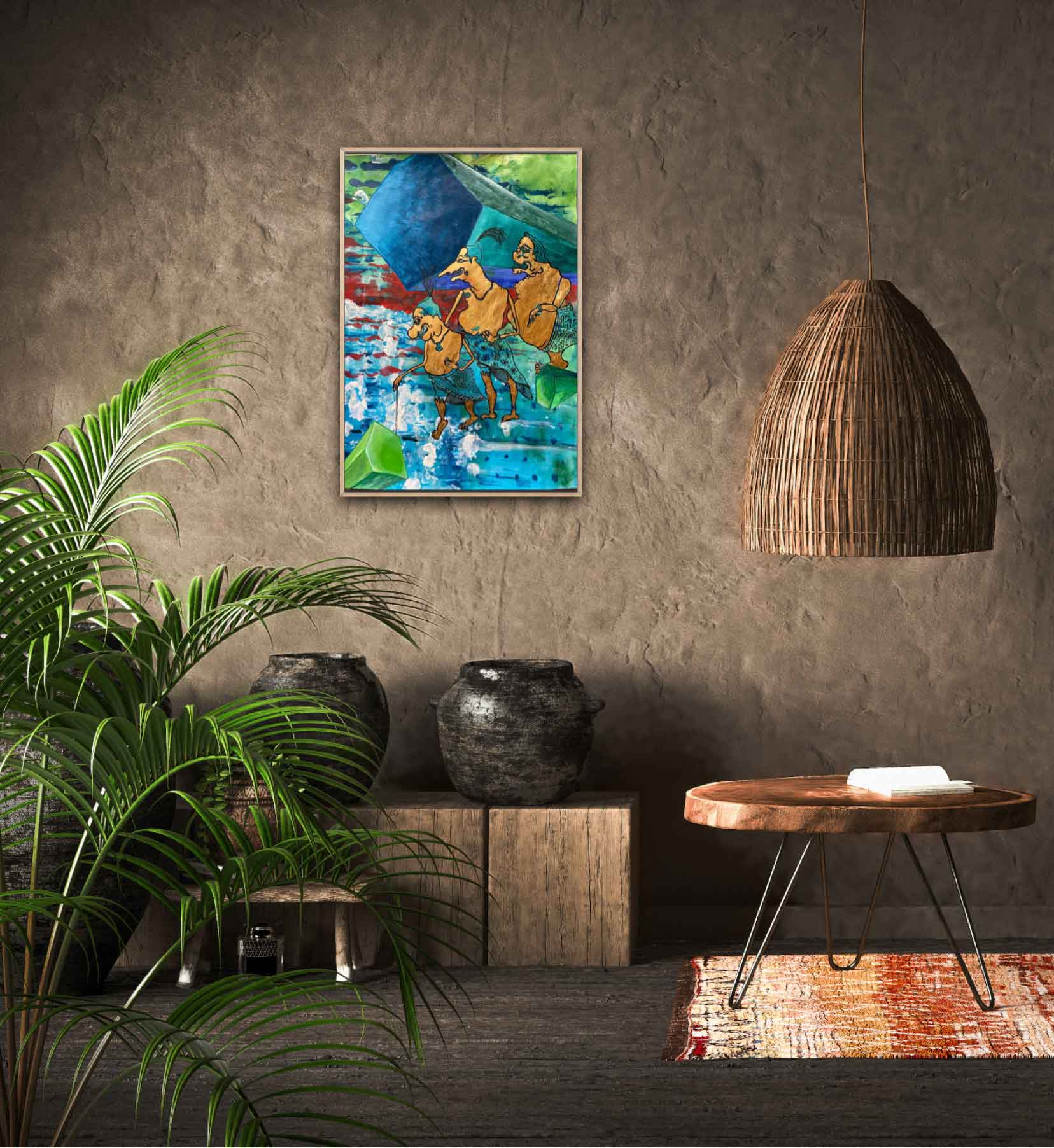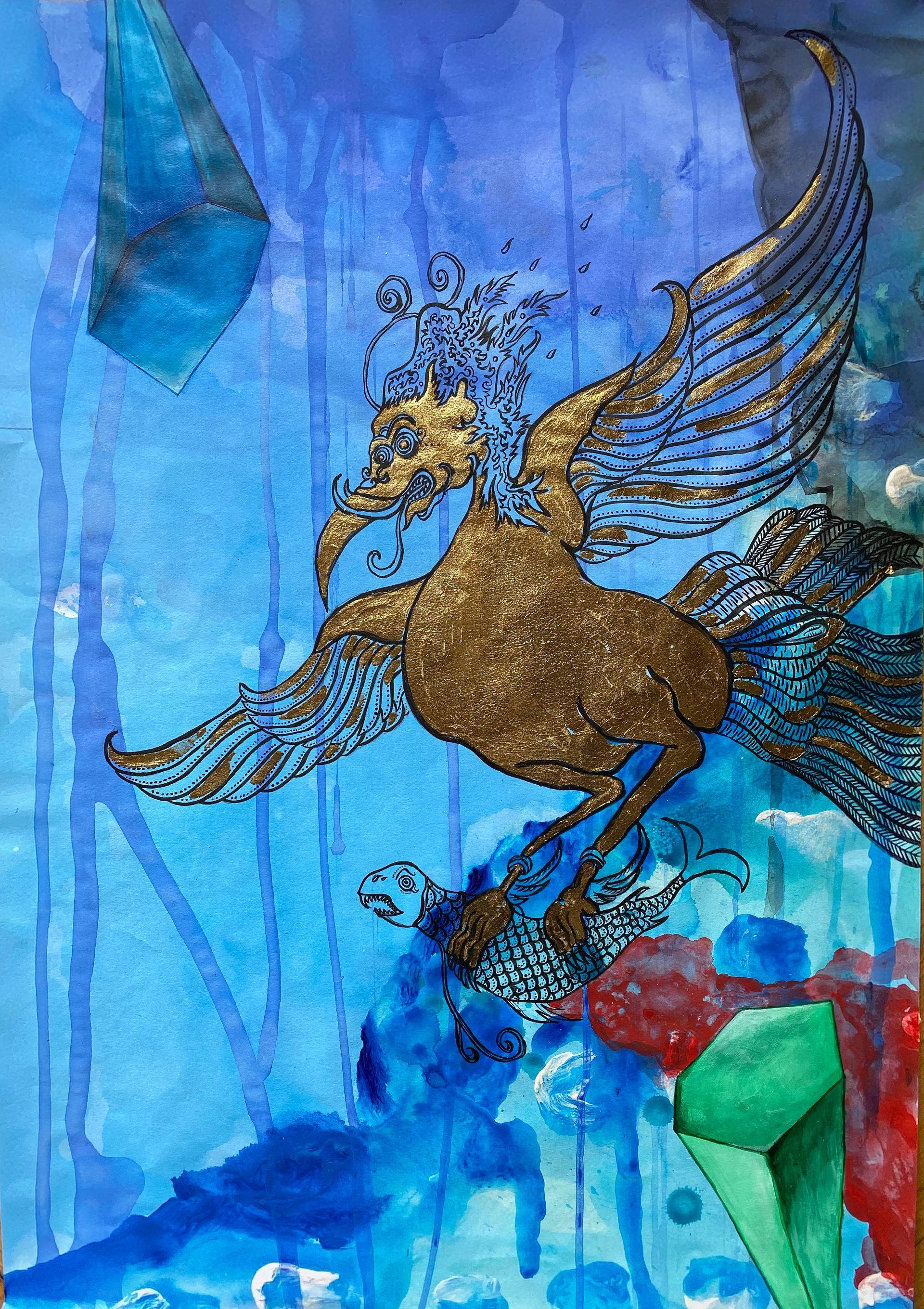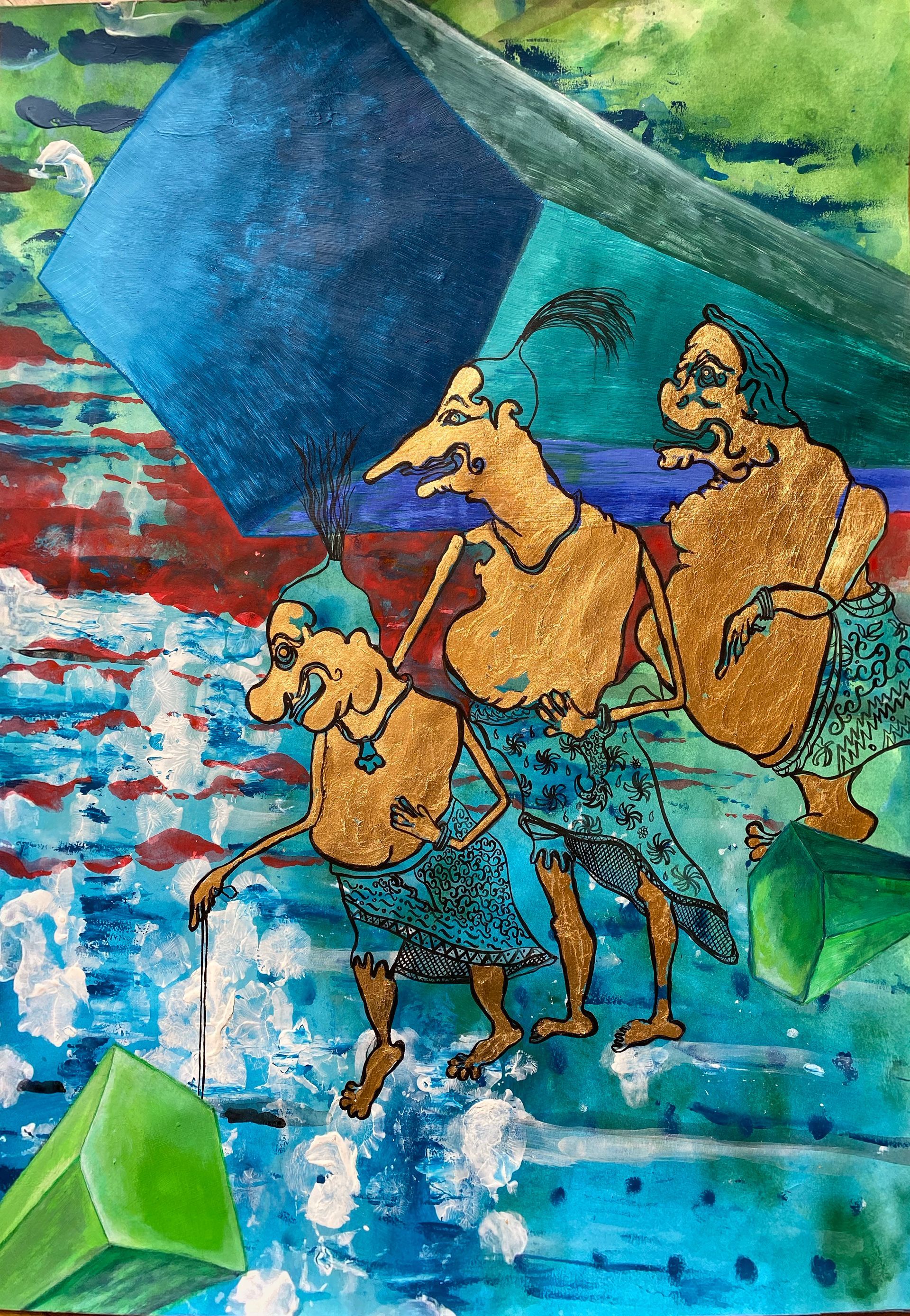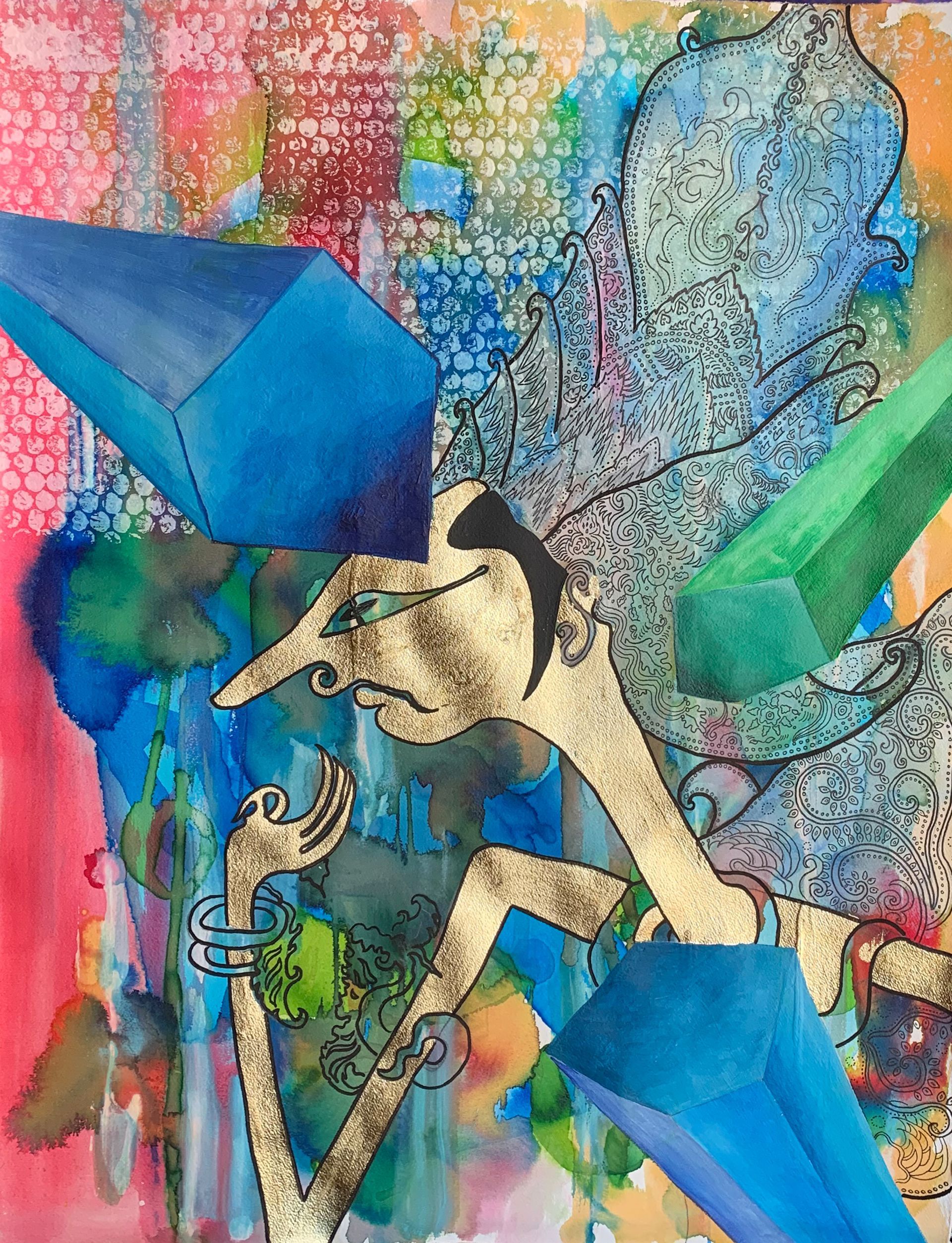 Punakawan vs Dalang SOLD Acryl and gold leaf on canvas 2022 120 x 80 cm