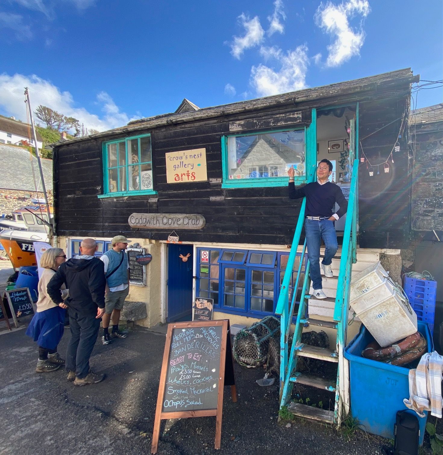 Aha K.R. präsentiert stolz einige seiner Cornwall-Bilder in einer kleinen Galerie in Cadgwith (England).